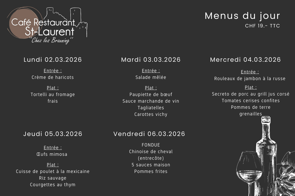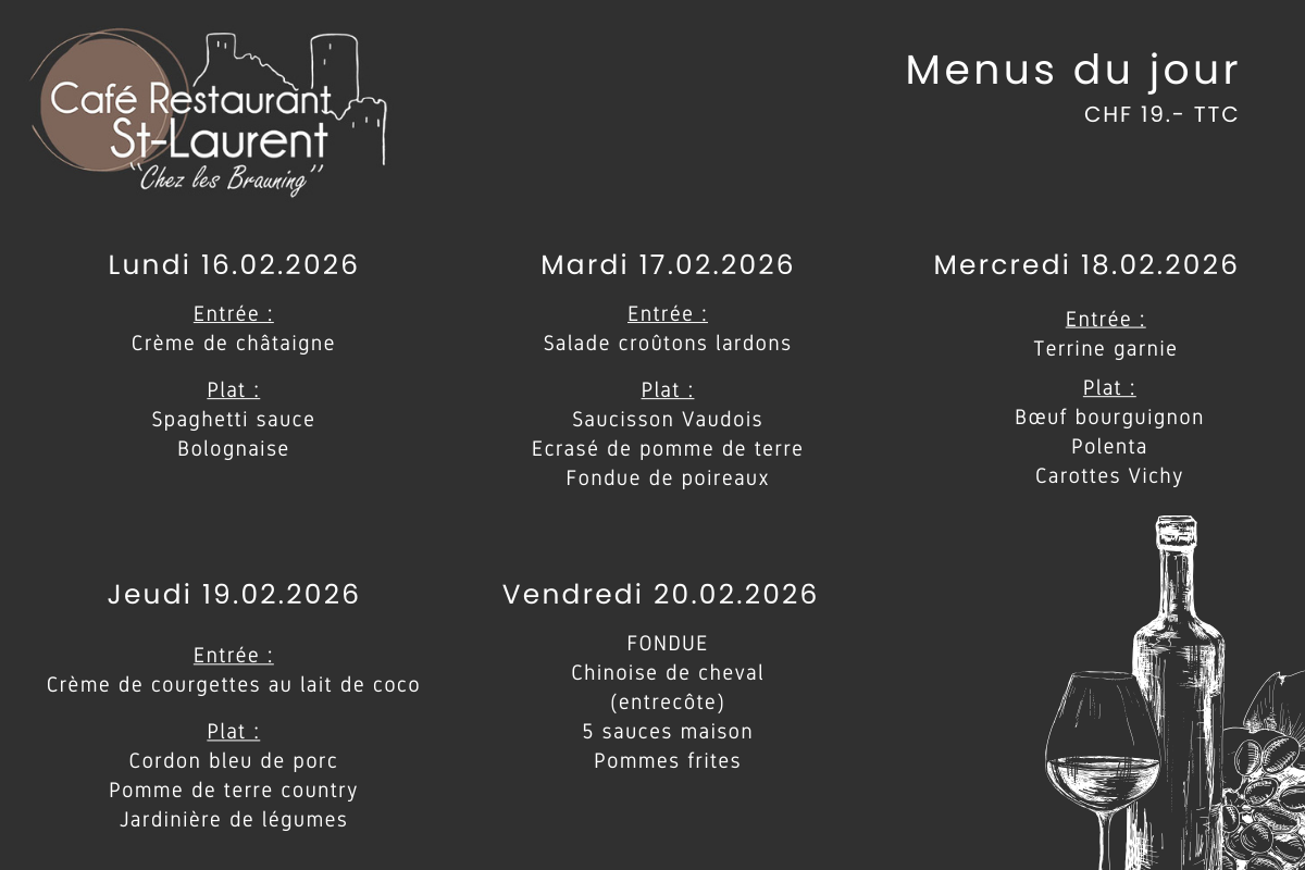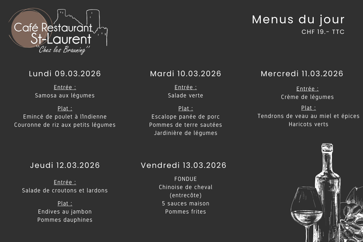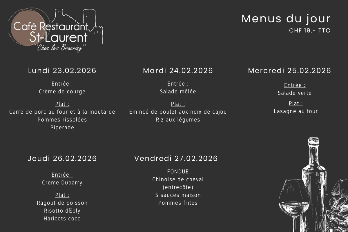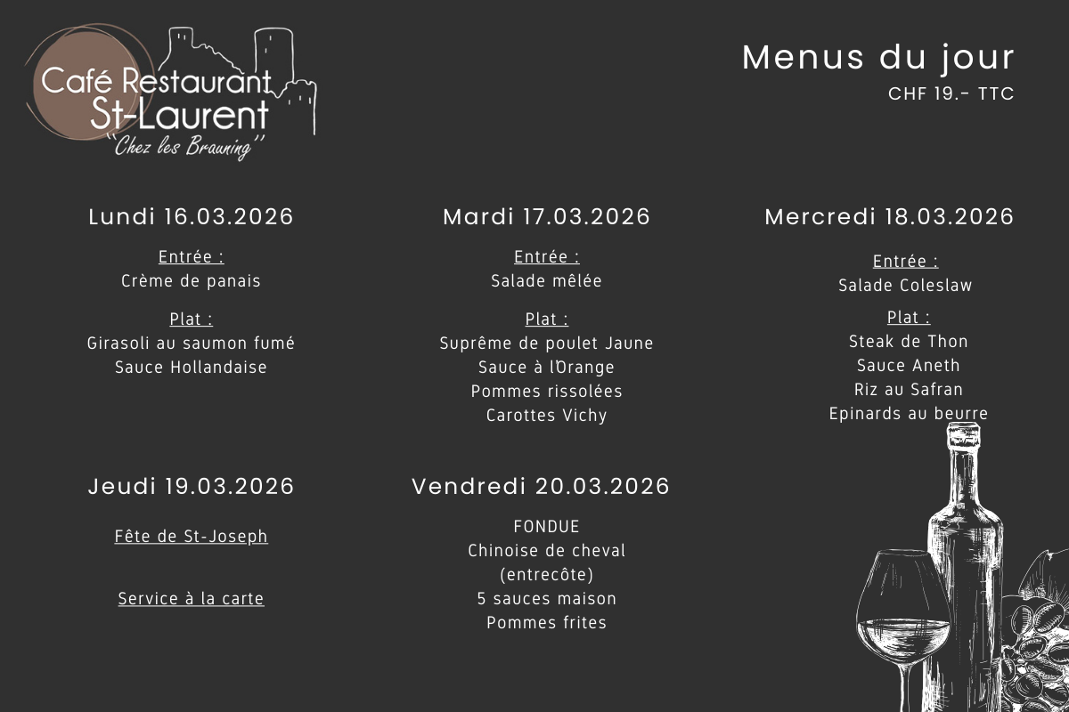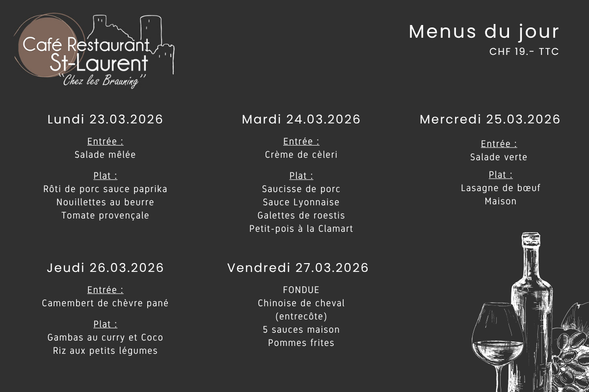 Menu du jour Menu du 23.03 au 27.03.2026 Découvrir » Menu du 16.03 au 20.03.2026 Découvrir » Menu du 09.03 au 13.03.2026 Découvrir » Menu du 02.03 au 06.03.2026 Découvrir » Menu du 23.02 au 27.02.2026 Découvrir » Menu du 16.02 au 20.02.2026 Découvrir »